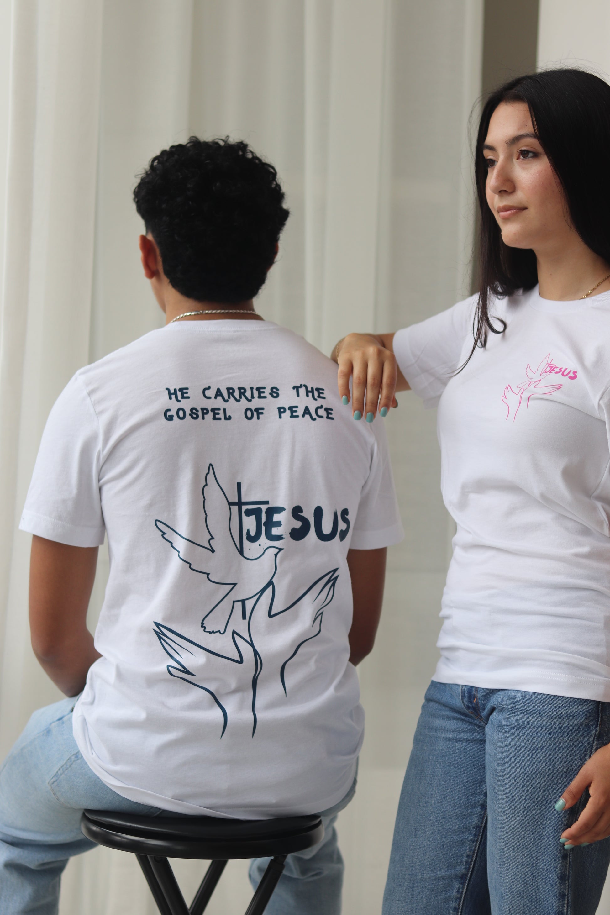 Inspired by Ephesians 6:15, this design is a wearable reminder you carry in you the peace of Jesus and you should share His good news wherever you go.