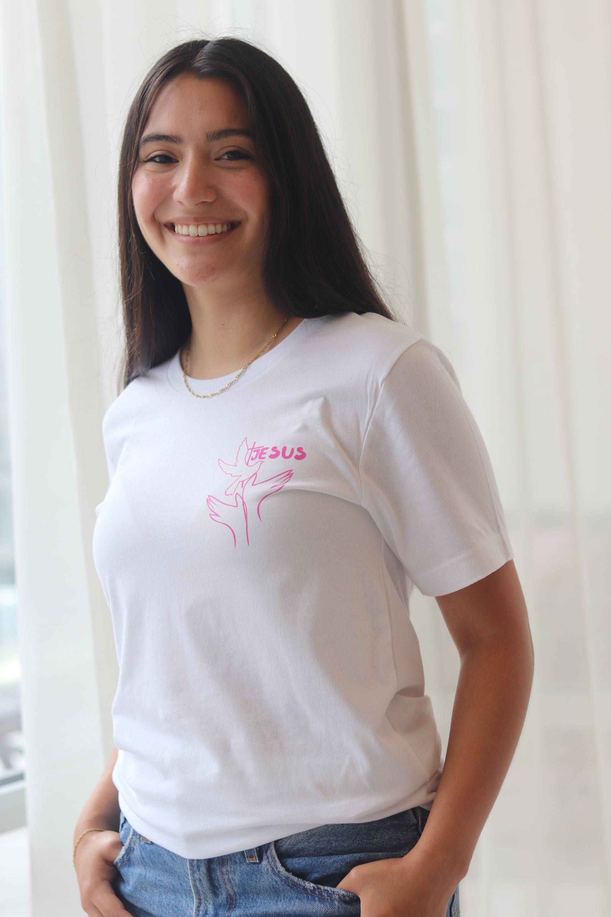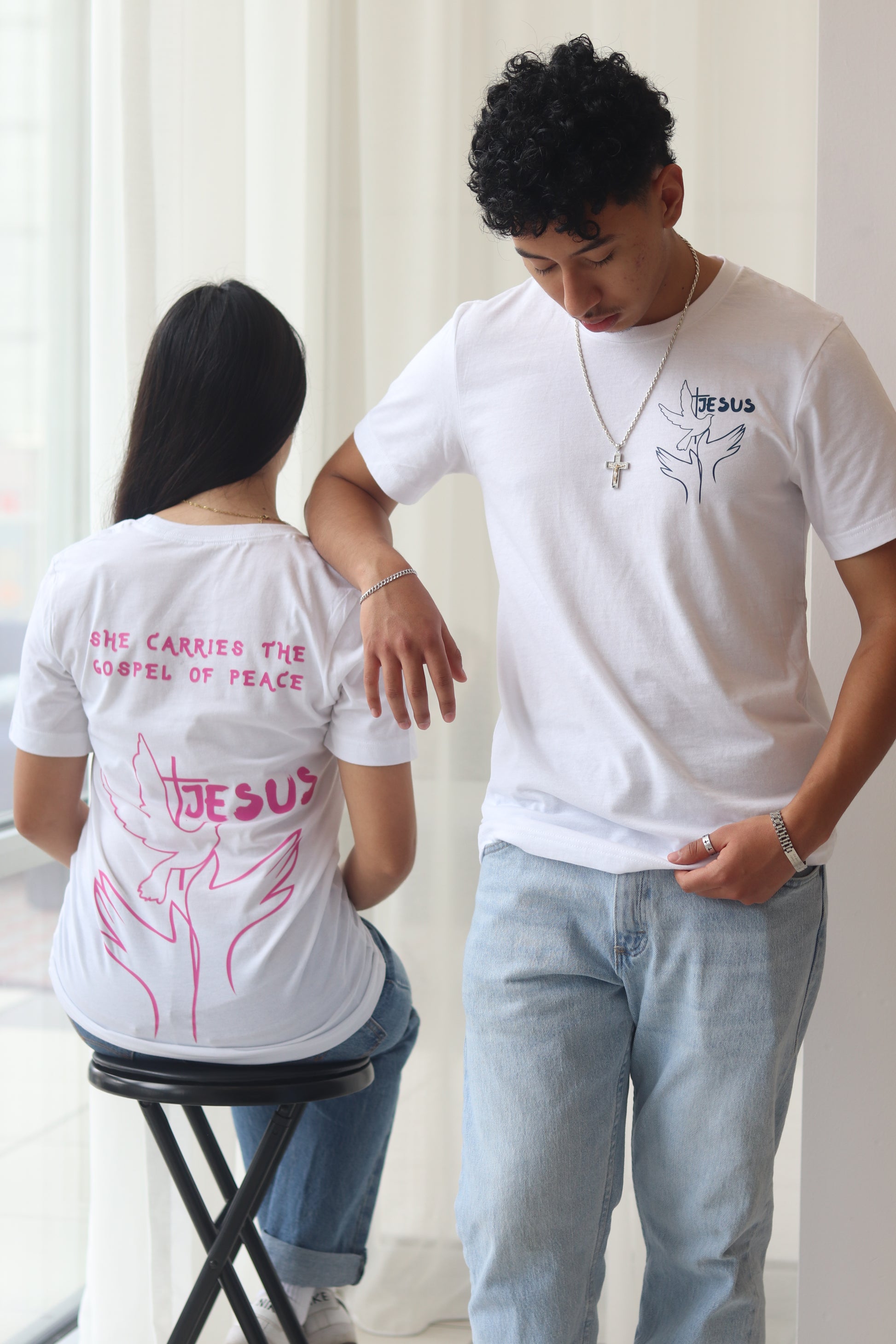 Inspired by Ephesians 6:15, this design is a wearable reminder you carry in you the peace of Jesus and you should share His good news wherever you go.
